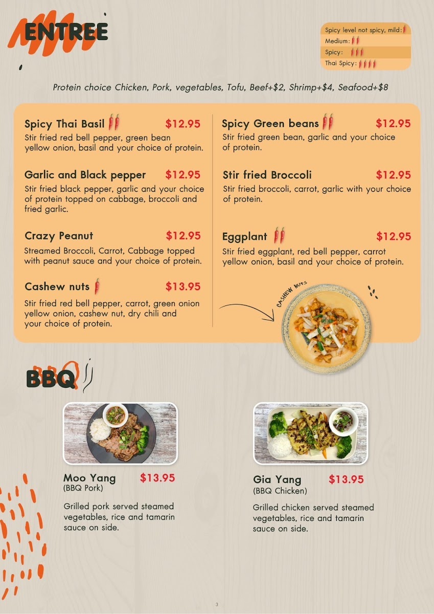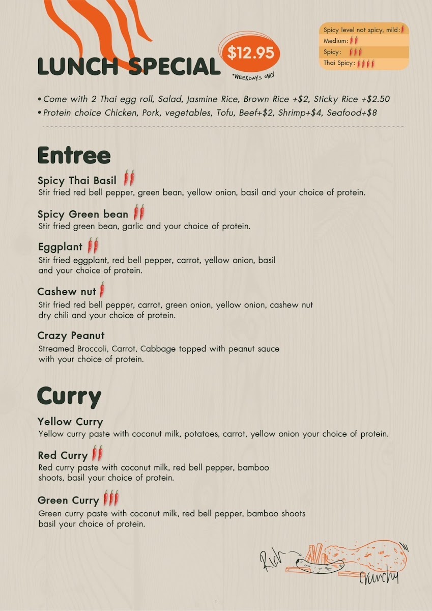 Comes with 1 Thai egg roll, Salad, Jasmine rice, or Brown rice, Sticky rice for an extra charge. Protein choice: Chicken, Pork, Vegetables, Tofu, or Beef, Shrimp, Seafood for an extra charge.