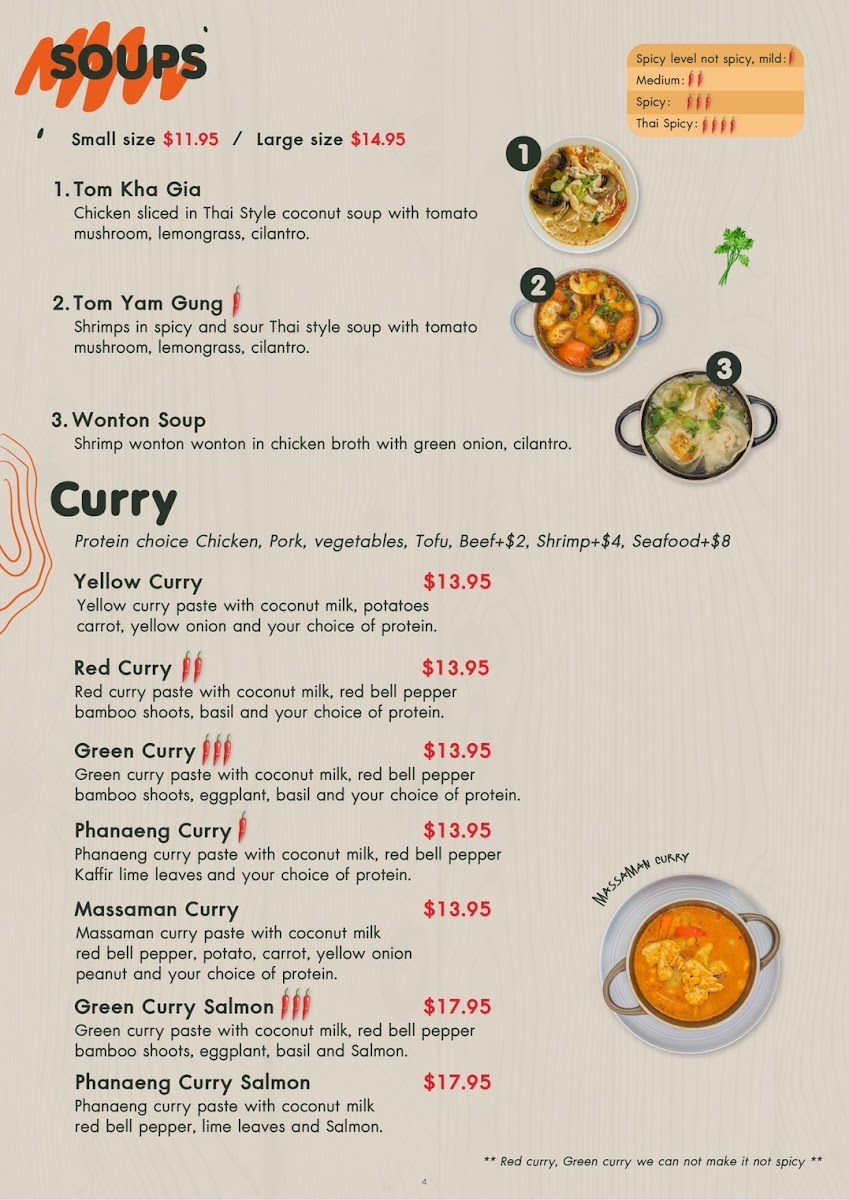 Yellow curry with your choice of chicken, pork, vegetables, tofu, beef, shrimp, or seafood (extra charge). Spice levels: 0* to 5*****.