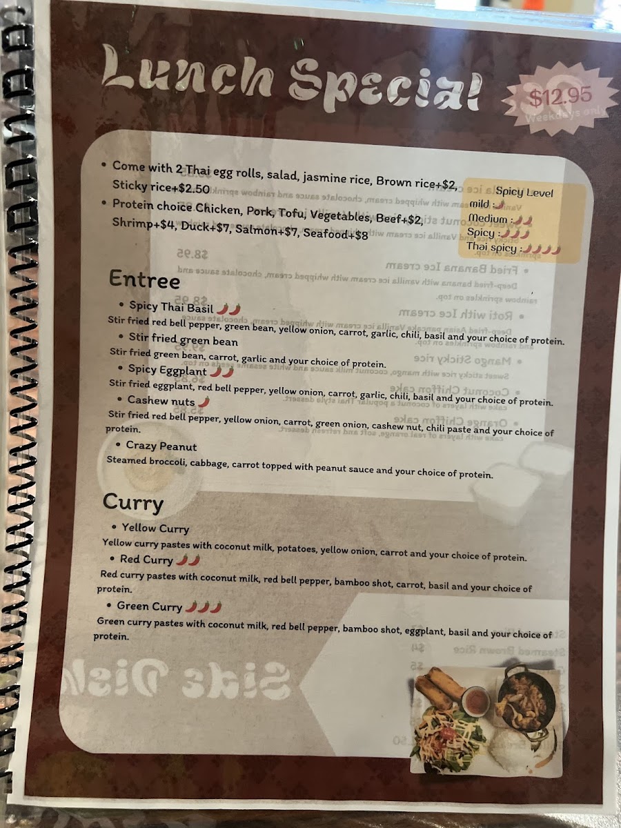 Come with 1 Thai egg roll, Salad, Jasmine rice, or Brown rice, Sticky rice for an extra charge. Protein choice: Chicken, Pork, Vegetables, Tofu, or Beef, Shrimp, Seafood for an extra charge.